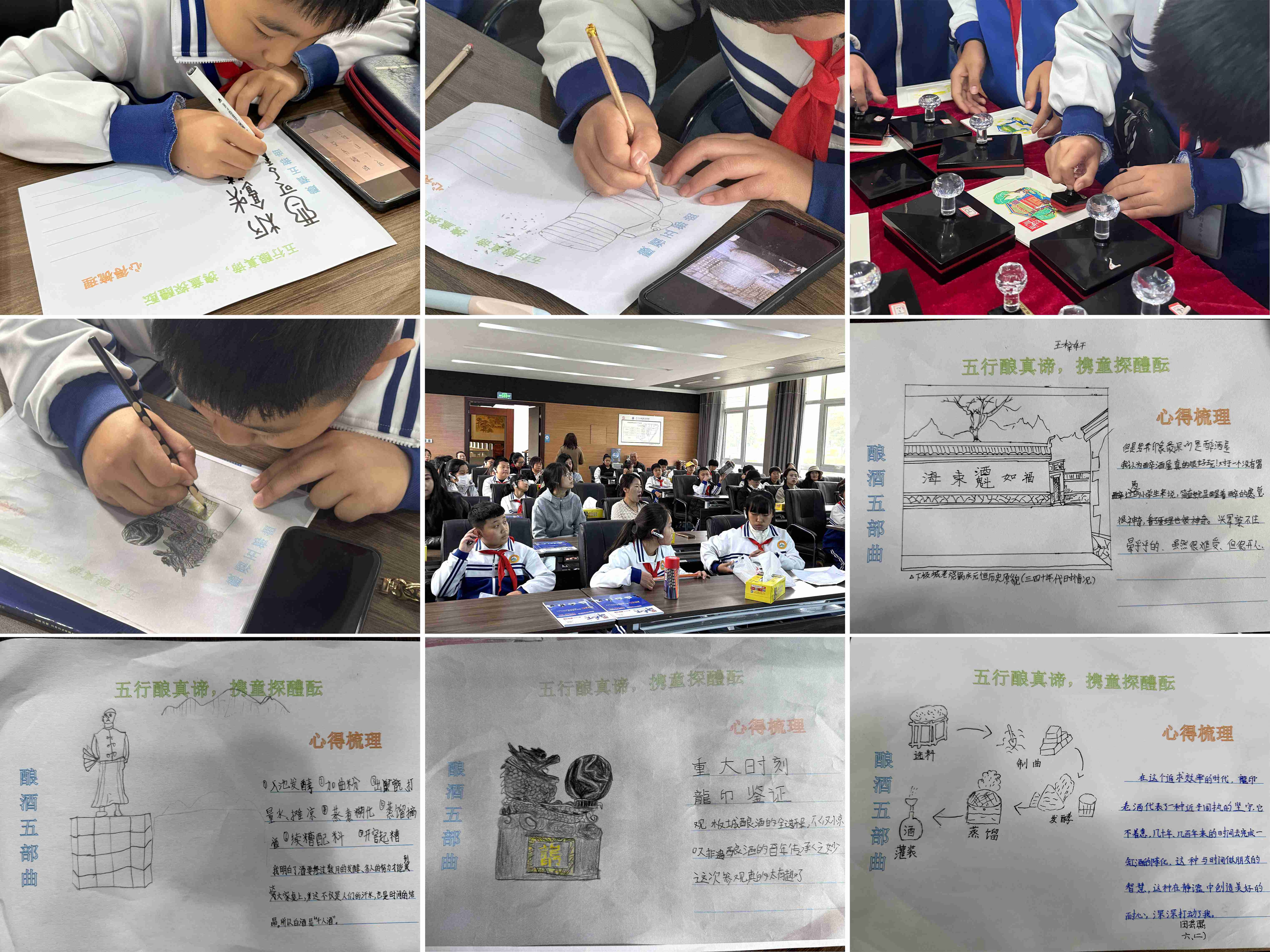 實(shí)踐創(chuàng)作環(huán)節(jié),孩子們伏案疾書,憑借細(xì)致的觀察,獨(dú)立繪制出從“原料篩選”到“灌裝”的完整釀酒流程圖,家長們則從旁協(xié)助,與孩子一同討論工藝細(xì)節(jié),梳理心得思路。