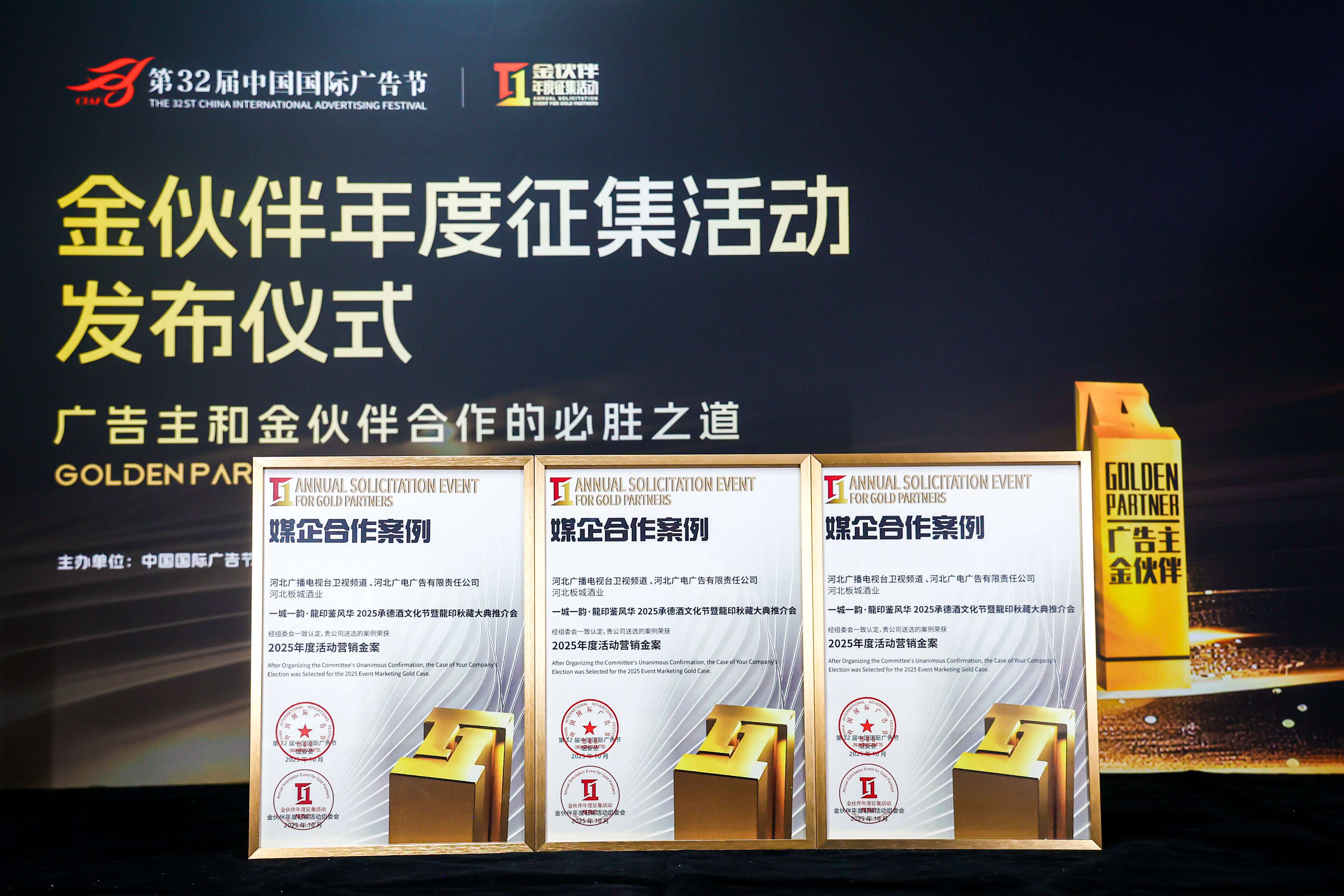 板城酒業(yè)在第32屆中國(guó)國(guó)際廣告節(jié)——2025金伙伴征集活動(dòng)發(fā)布儀式上,板城酒業(yè)憑借兩項(xiàng)媒企合作案例榮獲“2025年度活動(dòng)營(yíng)銷金案”“2025年度IP營(yíng)銷金案”兩項(xiàng)大獎(jiǎng),再度閃耀廣告節(jié)。