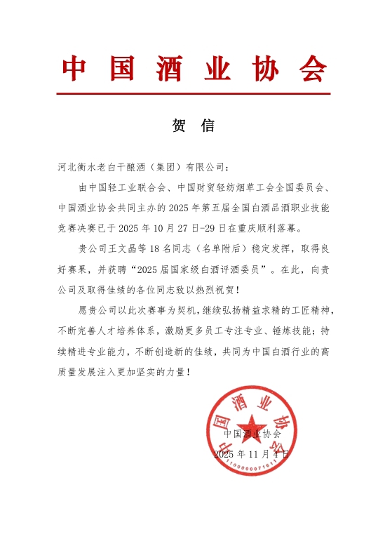 中國(guó)酒業(yè)協(xié)會(huì)發(fā)來賀信,在恭祝企業(yè)取得良好成績(jī)的同時(shí),希望以此次賽事為契機(jī),繼續(xù)弘揚(yáng)精益求精的工匠精神,不斷完善企業(yè)人才培育體系,持續(xù)增進(jìn)業(yè)務(wù)能力。