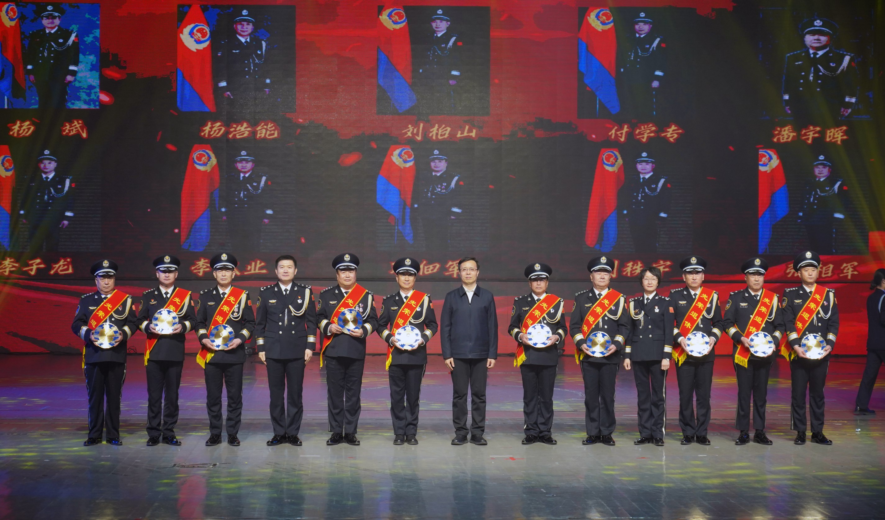 市委常委、政法委書記李曉波,省公安廳二級巡視員賈永華,市政府副市長、市公安局黨委書記、局長康海潮為退休民警頒發(fā)退休紀(jì)念盤